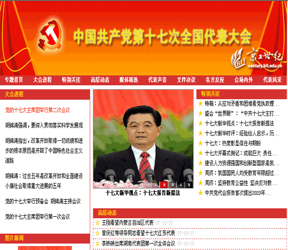 京工世纪网站开通的“十七大”专题共包括特别关注、大会进程、高层动态、媒体精选、代表声音、文件决定、各方反应、会场内外、代表风采等内容,对 “十七大”的相关情况及进展状况进行了较为详实的报道,为我校广大师生了解“十七大”提供了一个方便快捷的平台。