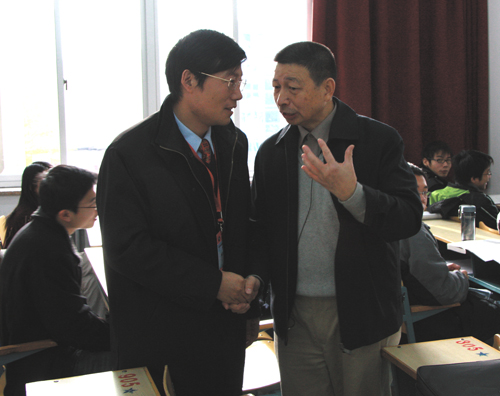 专家组成员、南京理工大学教务处处长、教授、博士生导师袁军堂听取韩伯棠教授和荣辉副教授讲授的课程后分别与两位教师亲切交谈。随后前往体育部观摩了体育课,并就体育教学有关问题与部分教师进行了座谈和交流,他还重点听取了我校足球队的建设情况。