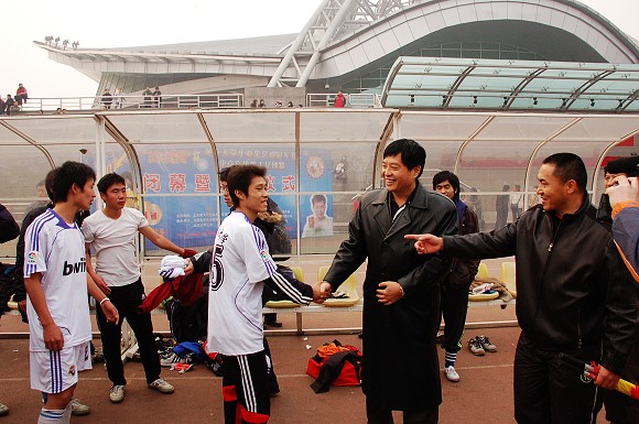校党委副书记侯光明祝贺校学生业余足球队夺冠。
