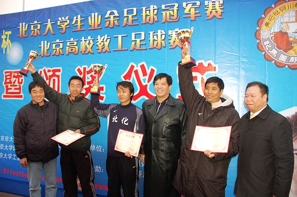 11月24日下午,在我校东体育场举行了2007年北京高校教工足球赛(“京都念慈菴”杯)和北京高校学生业余足球赛的冠亚军决赛,经过紧张激烈的拼搏,我校教工足球队以4:0的比分战胜了北京化工大学,我校学生足球队以3:0战胜北京工业大学,双双荣获本届比赛冠军。这也是我校教工足球队首此获得此项赛事的冠军。