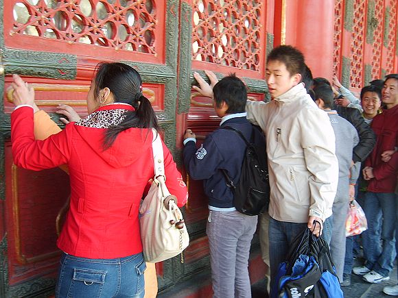 在导游的引导下,同学们慢慢行走在故宫中,每一位志愿者都成了盲校学生的眼睛,为他们描述着周围的一切,让他们用心感受这些沧桑的历史古迹,领略中华璀璨文化。在一些走廊的柱子和雕刻着龙凤的墙壁前,在御花园的石山前,志愿者们引导这些学生通过触摸来感知故宫。在钟表馆,志愿者们陪学生感受了有趣的钟表表演,虽然他们看不见眼前的一切,但他们每个人都听得很认真,每个人的脸上都洋溢着灿烂的笑容。不知不觉时间已近中午,盲校的学生已随志愿者踏过了故宫的大片道路。看着他们快乐的样子,志愿者们忘记了寒冷,忘记了劳累,只有那志愿者标志的微笑,温暖着每一个人的心灵。