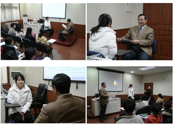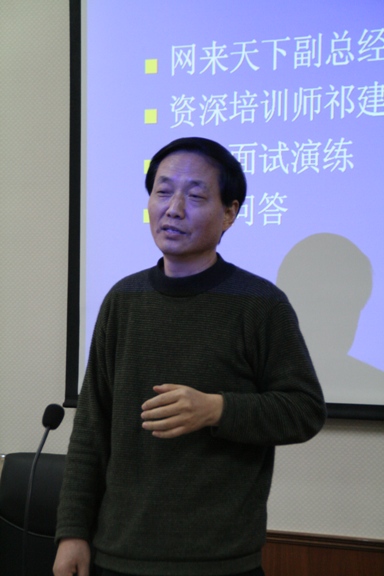之后,祁建华老师从专业角度和同学们展开交流,他先总体介绍了知名外企在招聘过程中的各种流程,以及外企人力资源主管对于应聘者考察的技巧,从而引申出作为应聘者,特别是学生求职者应如何应对这些选拔,其间祁老师还不时传递各种就业技巧,还与同学们进行了各种交流互动。