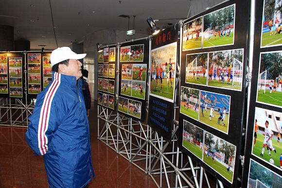 之后,金志扬教授和队员们一起仔细观看了足球队专题摄影展。