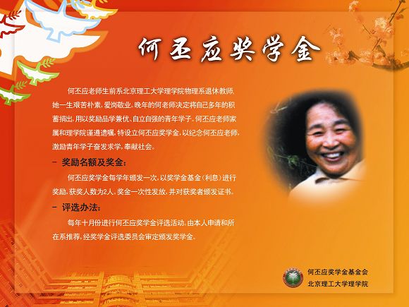 何丕应老师一生忠诚于党的社会主义教育事业,她一生艰苦朴素、勤劳奉献,对工作兢兢业业、任劳任怨,生活上严于律己,宽于待人。她不仅培养了一大批专业人才,更为我校物理学科的建设和发展做出了积极的贡献。何丕应基金会于2006年10月成立,基金会在ob真人竞猜理学院设立了“何丕应奖学金”,以激励广大理科学子心系祖国、勇攀科学高峰。2007年,经何丕应奖学金评选委员会认真筛选和民主合议,最终确定2004级物理系本科生刘雪峰和2005级物理系秦楠两名同学获得第二届“何丕应奖学金”荣誉称号。