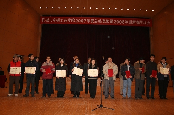 2008年1月18日,机械与车辆工程学院2007年度总结表彰暨2008年迎新春团拜会隆重举行。校党委书记焦文俊、全院在职教工、离退休老教师和学生代表欢聚一堂,对2007年度学院优秀集体及个人进行表彰与总结,并开展全院2008迎新春团拜会联欢活动。副院长丁洪生主持总结表彰会。