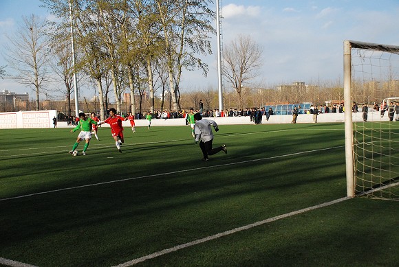 面对对方守门员和后卫的双重封堵,张宇果断起脚,皮球穿裆而过直奔球门。