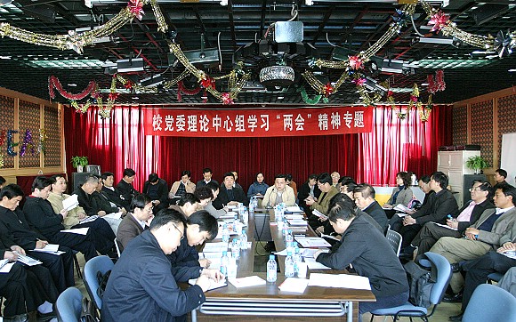 2008年4月3日上午,校党委理论学习中心组在远志楼四楼多功能厅专题学习“两会”精神。全国政协委员、我校校长胡海岩作了关于“两会”精神的主题报告,党委书记郭大成主持学习,校党委中心组成员、全校正处级干部、主持工作的副处级干部、副处级单位负责人、民主党派及党外人士代表等90余人参加了集中学习。