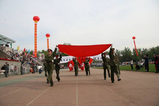 运动会开幕式上,校领导与来宾、运动员、教练员、裁判员及观众高声歌唱中华人民共和国国歌。