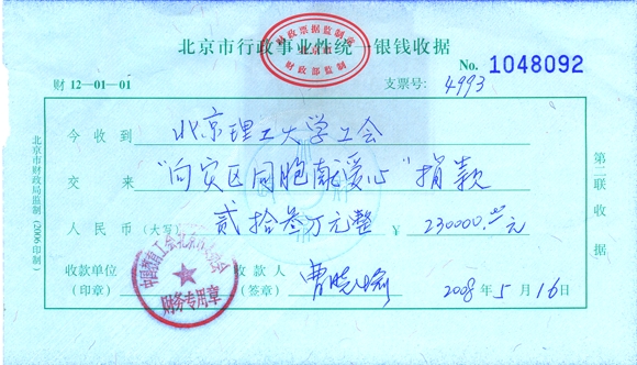 由ob真人校工会组织的“情系灾区、奉献爱心”募捐活动,截止到5月16日上午10时,已收到捐款630,893.00元,捐款在继续,爱心在继续。我校已将先期募捐到的23万元救灾款送北京市教育工会,由北京市教育工会统一转交灾区人民。
