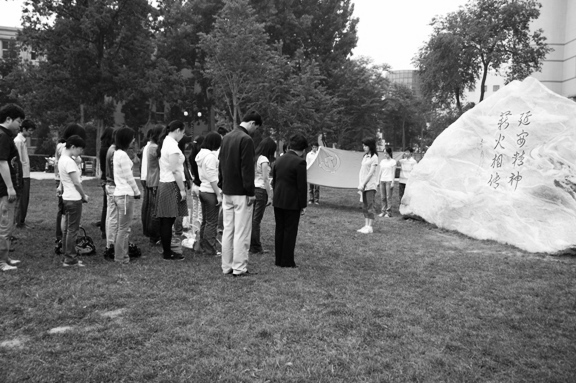 2008年5月20日,在举国哀悼汶川大地震的时刻,生命科学与技术学院2007级研究生党支部,在我校中心花园刚落成的“延安精神 薪火相传”巨石前,举行了具有特殊意义的宣誓仪式,生命学院党委书记李兰东老师,副书记、副院长周连景老师参加本次仪式。