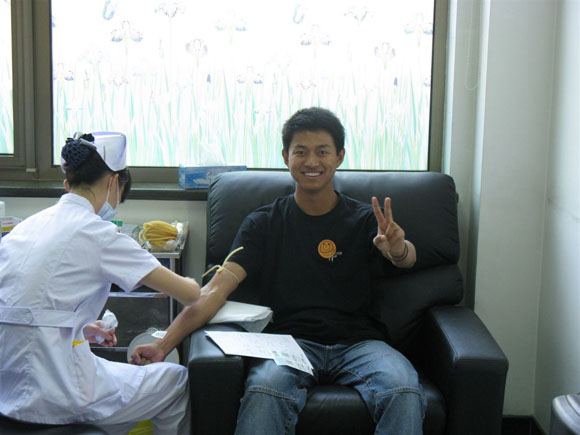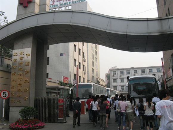 5月23日早上,载有50多名志愿者的校车驶向北京红十字会血液中心,在几名骨干志愿者的组织下统计人数、填表、体检、献血、集合休息。