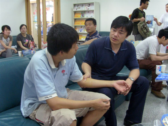 代方震老师与志愿者同学沟通献血后休养等方面的知识
