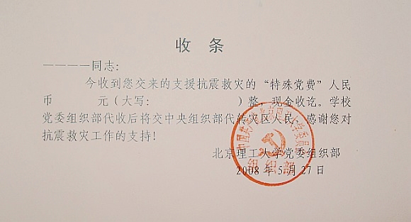 根据中组部《关于进一步做好抗震救灾“特殊党费”收缴等有关工作的通知》的要求,我校继续按照“自觉自愿、量力而行”的原则,坚持不定标准、不作硬性要求,接受广大党员同志交纳的“特殊党费”。在受理过程中,不论数额多少,都统一开具收据,以表感谢。“特殊党费”交纳清单可通过校园网组织部网页进行查询。