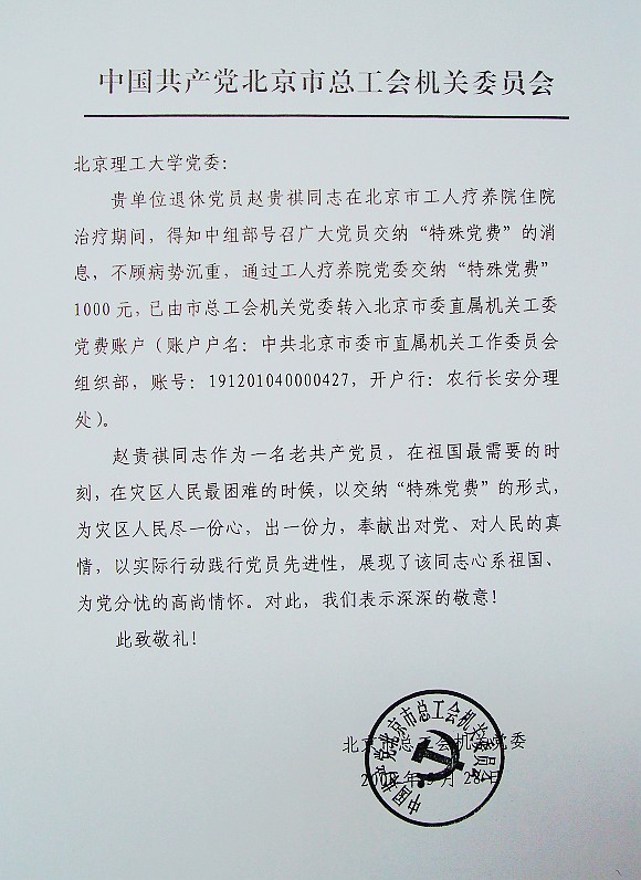 近日,学校党委收到北京市总工会机关党委发来的表扬信,表扬我校退休职工、党员赵贵祺同志在北京市工人疗养院住院治疗期间,得知中组部号召广大党员交纳“特殊党费”的消息后,不顾病势沉重,通过工人疗养院党委交纳1000元“特殊党费”的感人事迹。