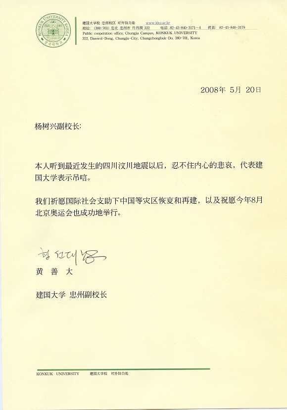 韩国建国大学忠州副校长黄善大发来慰问函