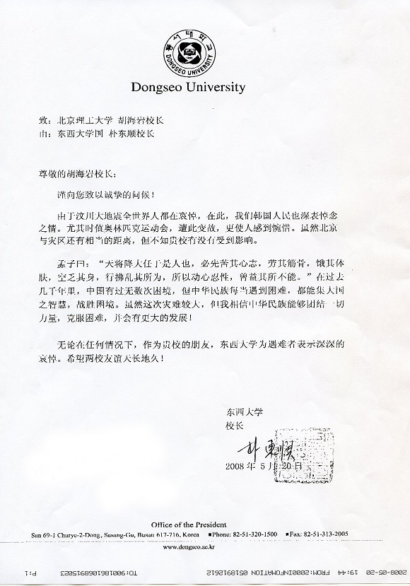 韩国东西大学校长朴东顺发来慰问函