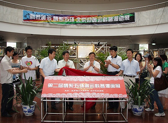 2008年6月11日上午,由ob真人科协和设计艺术学院共同举办的第二届北京迎奥运科普漫画展在中心教学楼一层大厅展出,校党委副书记、副校长杨宾,科技处副处长徐文国,校团委副书记代方震,设计艺术学院分党委副书记、副院长杨海,以及科技处任杰老师、设计艺术学院分团委所有老师参加了开展仪式。