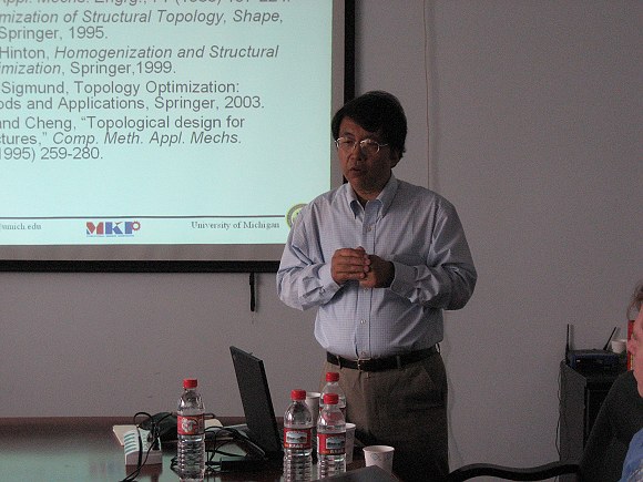 Zheng-dong Ma教授就目前国际上结构优化的热点问题做了题为“Topology Optimization for Innovative Structural and Material Designs”的学术报告,详细讲解了拓扑优化的内涵、发展历程和趋势,介绍了拓扑优化的数学模型及优化算法,并结合拓扑优化技术在美国汽车工程领域的应用实例进行了讲解,对密歇根大学在这一先进结构优化技术领域所做的工作进行了深入介绍。