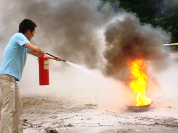 讲解培训环节结束后,实战演练开始,经过工作人员的精心筹备,现场点燃了两个模拟火源,同学们按照之前的讲解要求,手持灭火器,跑步至指定位置,对准火源准确喷射,在一次次的喷射中,同学们亲身感受了面对火源的“临战”感觉,在实际演练中掌握灭火器的使用知识。