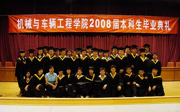 学生代表栗鹏同学代表全体2008届毕业生发言:四年前,不同的际遇、不同的生活、不同的理想让我们走到一起,走进机械与车辆工程学院,分别的时候,衷心祝愿大家有同样成功的事业,同样灿烂的未来,同样精彩的人生。感谢学校、学院为我们搭建了这么好的学习、发展的平台,感谢学院所有老师们对我们的培养和爱护。祝所有的同学在新的人生路途上,一路顺风。