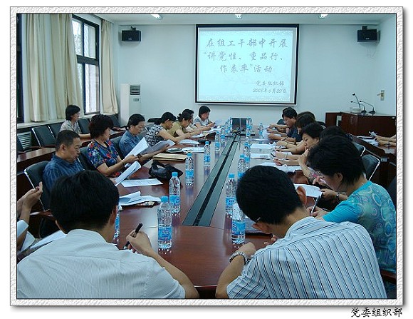 2008年6月20日上午,校党委组织部在主楼尾楼一层会议室召开专题工作会议,组织部同志及各分党委(党总支)和直属党支部等部门的组工干部参加了会议。会议传达学习了中组部《关于在全国组织系统开展“讲党性、重品行、作表率”活动的意见》和中组部部长李源潮在全国组织系统开展“讲党性、重品行、作表率”活动视频会议上的讲话精神,对在全校组织工作干部中开展“讲党性、重品行、作表率”主题实践活动进行了动员部署,要求全体组织工作干部结合学校实际,认真学习文件精神,不断提高自身的思想政治素质和业务能力;进一步改进工作作风和工作方式方法,立足岗位,为基层教师服务,为工作对象服务;以改革创新精神推进组织工作,更好地为学校改革发展建设服务;通过优质高效的服务,使党满意,使师生员工满意。党委组织部相关负责同志还就建党八十七周年工作安排、党群零距离工程、党费收缴、党员情况半年统计等工作进行了安排。