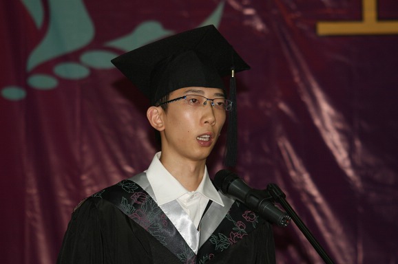 2004级本科生英郑欣同学做为毕业生代表发言,他回忆了在生命学院学习生活中难以忘怀的点点滴滴:表达了对培养了自己四年的学院依依惜别之情,同时他代表在座的每一位毕业生表示,在今后的岁月中将不断地学习提高自己,励精图治回报学院的培养之恩。