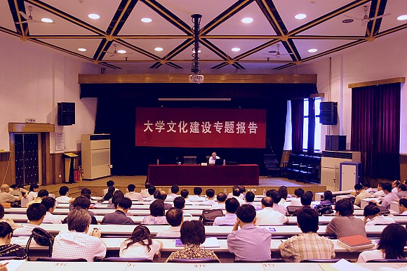 6月26日下午,校党委理论学习中心组在七号楼一层报告厅举行扩大学习,校、院(处)两级理论学习中心组成员、系主任、教工党支部书记、师生代表等300多人听取了著名高等教育专家、原国家教委高教司副司长王冀生教授有关大学文化建设的专题报告,报告的主题为“文化理性与思想解放”。报告会由党委书记郭大成主持。