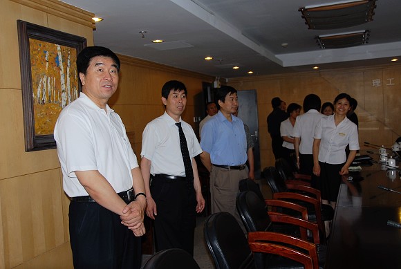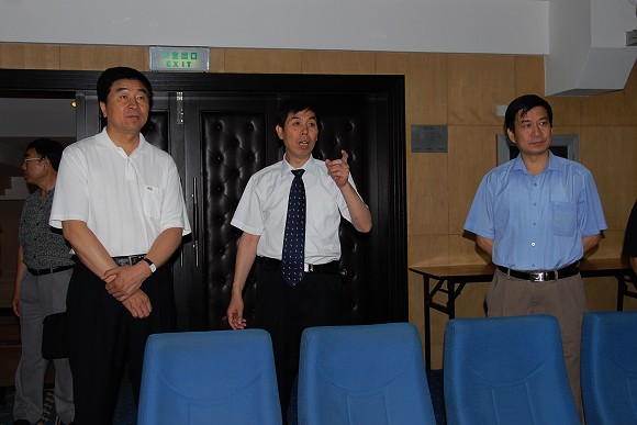 7月9日下午,校党委书记郭大成、纪委书记杨蜀康到刚装修完工恢复营业的国际教育交流大厦检查工作,房地产办公室主任李希荣向校领导介绍大厦的施工改造情况。