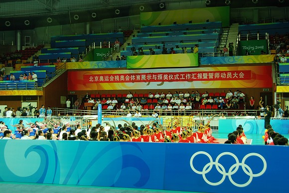 2008年7月20日,北京奥运会、残奥会体育展示与颁奖仪式工作汇报暨誓师动员大会在ob真人竞猜体育馆召开。北京市委常委、宣传部长、北京市副市长蔡赴朝、北京市委宣传部常务副部长肖培等出席。会议由北京奥组委执行副主席蒋效愚主持。