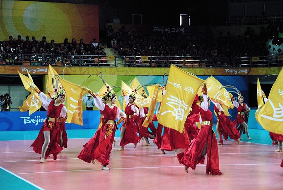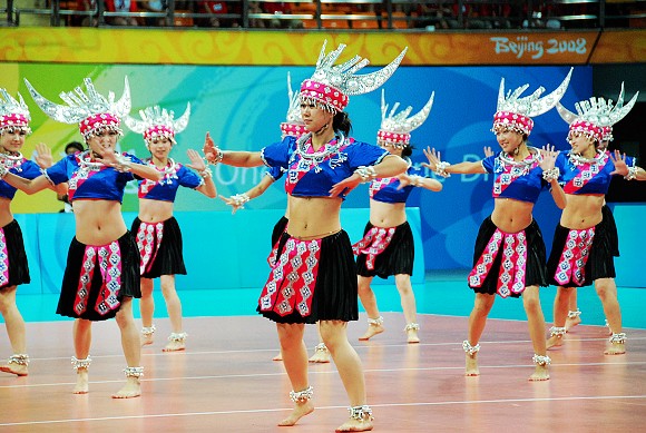 不同的民族风情韵味使现场观众群情激昂振奋,展现了中国56个民族手拉手、心连心喜迎奥运的画卷。