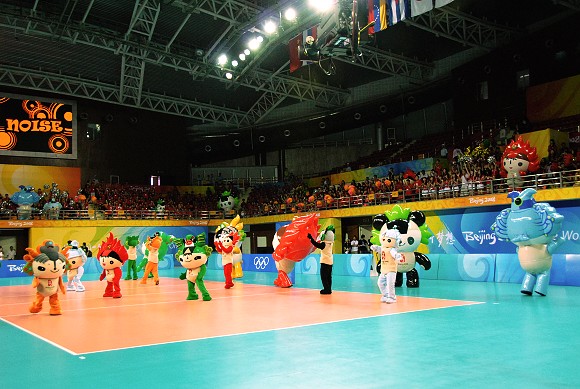 当15个可爱的福娃活灵活现的出现在现场时,那活泼俏皮的模样逗乐了每一个人。他们挥舞着双手,向观众致意“北京欢迎您”。整个表演赢得了大家的阵阵掌声和欢呼声,激情热舞中,传统民族风情服饰与中国古典音乐,青春与少年勾勒出了一幅盛世中国激情迎奥运,我们正年轻的史诗画卷!