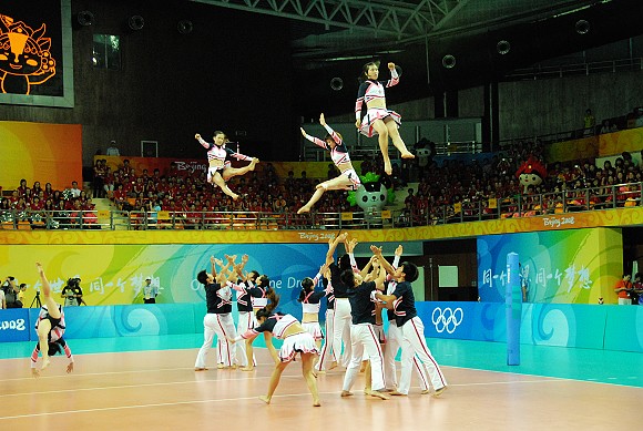 竞技型拉拉操表演热情活泼、激情四射,饱满的精神和高难度的动作展示了竞技拉拉操的力与美,感染了现场众多观众,他们纷纷制造人浪来回应拉拉队,台上台下2000多人一片和谐,全场气氛爆棚。