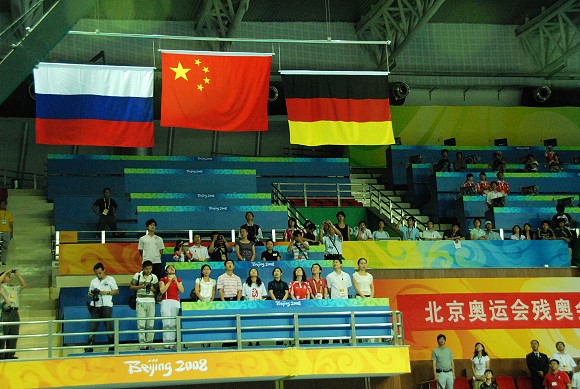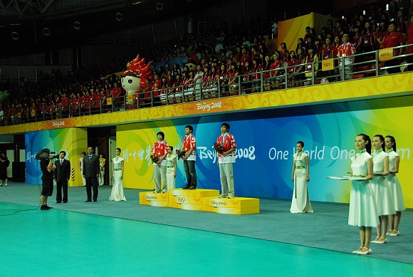 在颁奖演练中,奥组委选择的是乒乓球这个中国夺冠希望最大的项目。具体则是男单项目的颁奖,由“国际奥委会主席罗格和国际乒联主席沙拉拉”负责颁奖。有意思的是,模拟颁奖的3位“运动员”的名次划分颇有点预言的意思。铜牌颁发给了德国的玻尔,银牌颁发给了白俄罗斯的萨姆索诺夫,金牌则留给了中国的王励勤。中国男单在经历了雅典的失手之后,这次中国乒乓球队准备非常充分。冠军是否真的会被王励勤夺走,我们拭目以待。