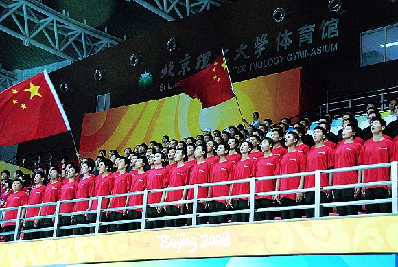 在升国旗演练中,据负责国旗的志愿者透露:奥运会真正颁奖时,将会有3套升国旗的方案。第一套是在电力充沛的情况下顺利升起。而一旦电力不足,升旗仪式将会由人工进行补充。由于升旗旗杆比较重,若是完全停电,则需要5个人使尽全力才能把旗杆完全升起。在之前的一次演练中,曾经测试过由两个人将旗杆拉起,但两人共用了1分44秒。到目前为止,所有国家的国歌最长的也不过是55秒钟。