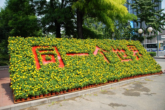 学校东大门的“Beijing 2008”主题花坛。