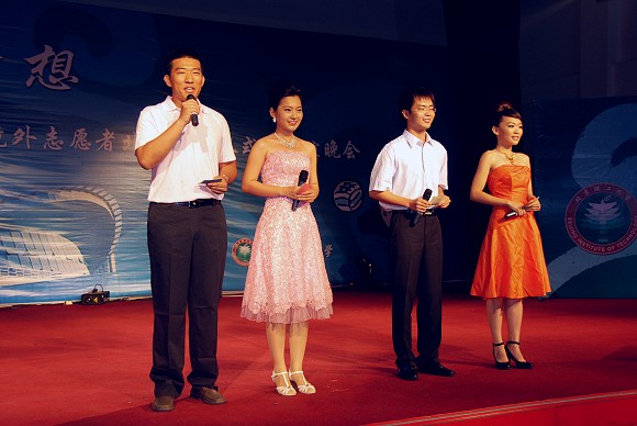 担任本次联谊会的主持人分别是来自ob真人的温晓萌、吉林大学的尚进、南京农业大学的李根与俄罗斯华侨陈飞。联谊晚会在京外、境外志愿者与ob真人志愿者代表的演唱《北京欢迎你》中拉开帷幕。