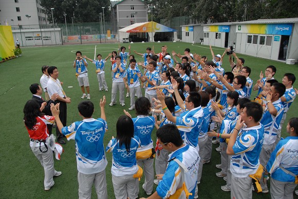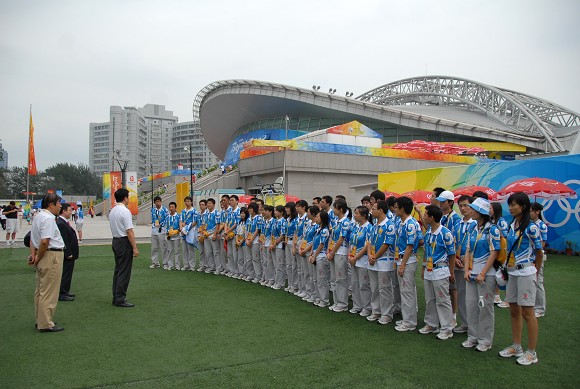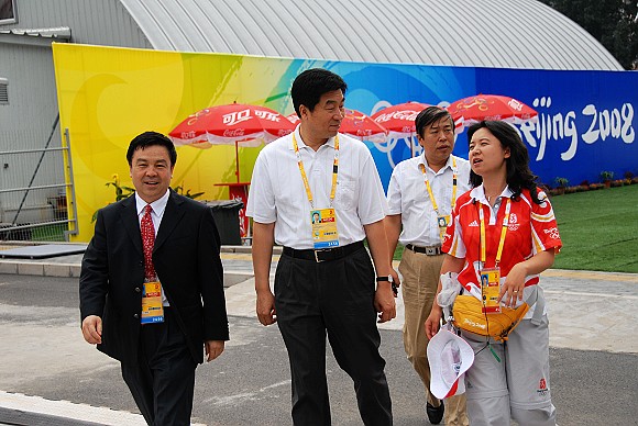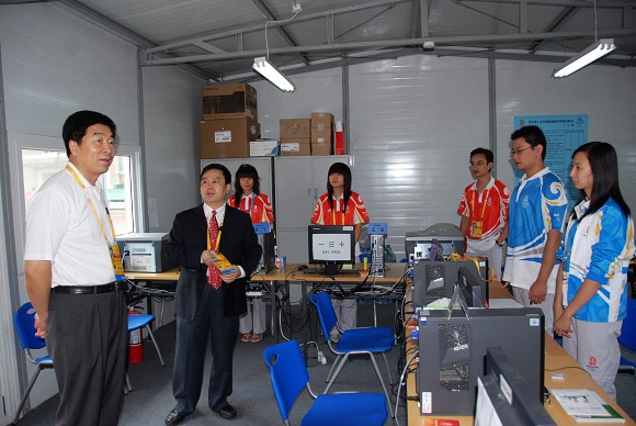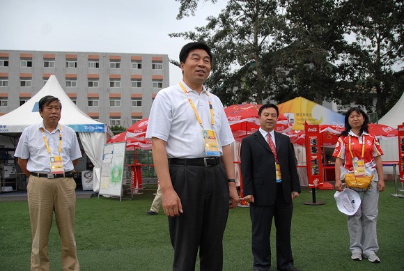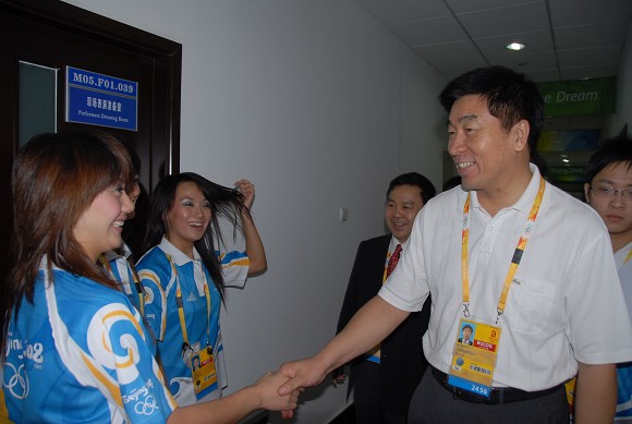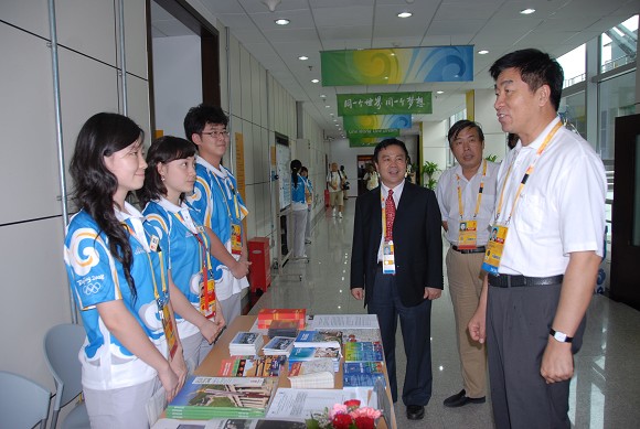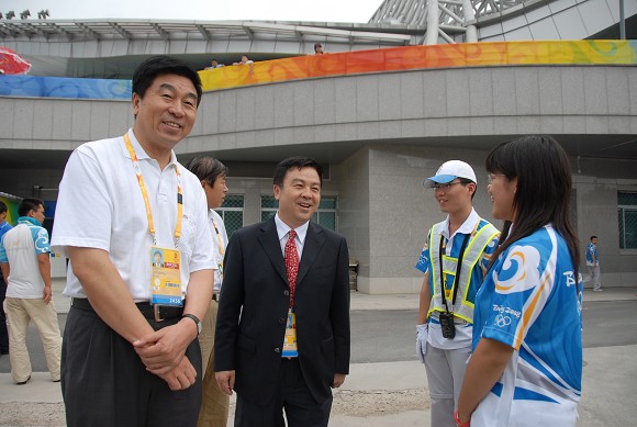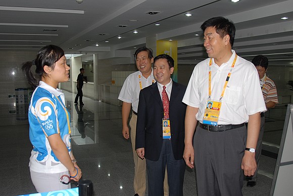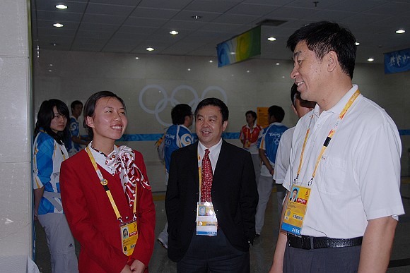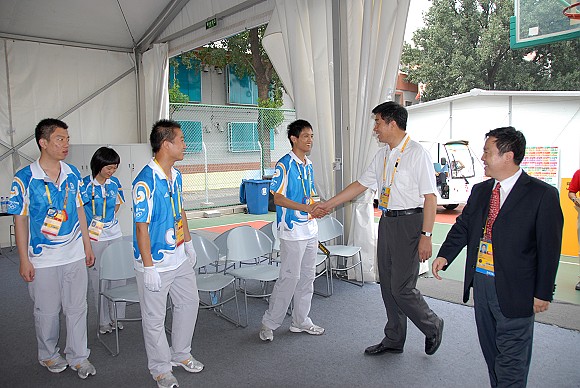 奥运排球比赛期间,我校党委书记郭大成多次来到体育馆看望和慰问奥运志愿者,场馆主任、党委副书记、副校长杨宾和副校长李和章陪同看望和慰问。