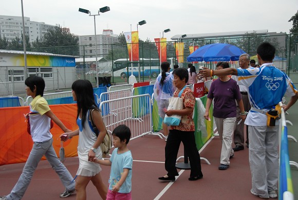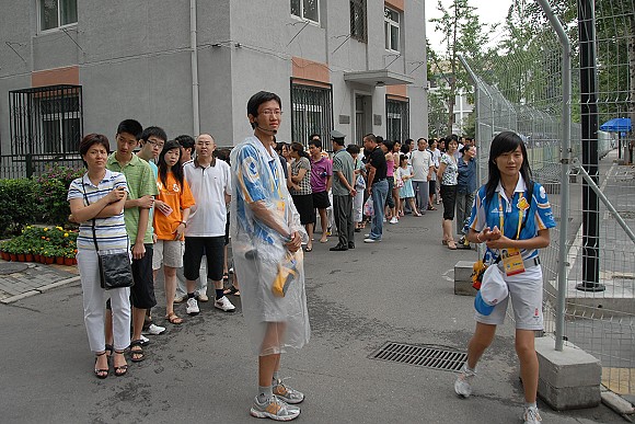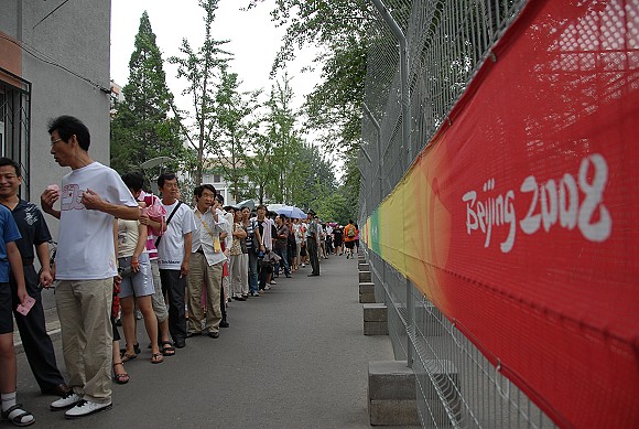 师生们的观赛热情从长长的队伍中可见一斑。
