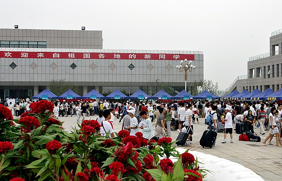 迎新车辆停下的场地附近,各学院的学生都想尽了办法吸引本院的新生,这是管理与经济学院的学生在迎接新同学的到来。