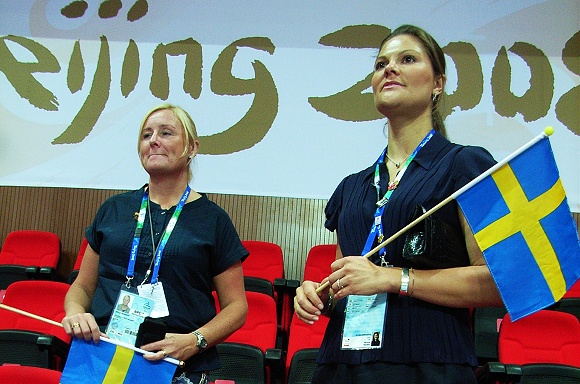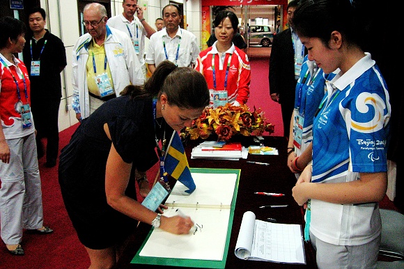前来参加北京残奥会及相关活动的瑞典王储维多利亚公主于9月10日、11日连续两日来我校观看了瑞典男女盲人门球队的比赛。经过激战,10日20时的比赛中瑞典男子盲人门球队以6:5险胜加拿大男子盲人门球队,11日13时的比赛中瑞典女子盲人门球队以5:4险胜巴西女子盲人门球队。