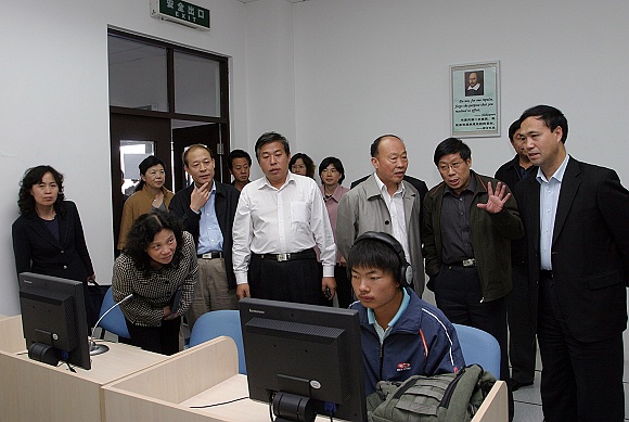 调研代表到外语语音室参观和了解同学们在大学英语网络自主学习中心的学习情况。
