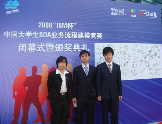 在刚刚结束的2008"IBM杯"中国大学生SOA流程建模大赛中,由软件学院金福生老师指导下的池建超,徐静,许颖三位软件学院本科同学组成的"Together"团队获得该大赛的大中华区优胜奖.中山大学、台湾云竹大学、北京交通大学夺得了大赛的冠亚季军。