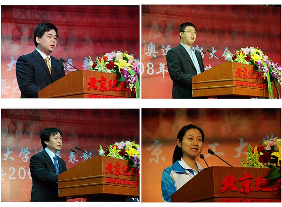 表彰大会上,机械与车辆工程学院林程教授(左上)、保卫处处长李汉军(右上)、我校奥运场馆运行团队秘书长王贵明(左下)、志愿者代表黄霆(右下)分别从“科技奥运、平安奥运、场馆运行、志愿服务”四个方面进行了发言。林程教授首先讲述了我校纯电动客车研发团队在奥运会期间,为保障奥运中心区电动客车的正常运作做出的努力,他们实现了“零抛锚、零排放”的目标,为“绿色奥运、科技奥运”的成功举办做出了突出贡献,并因此获得了党中央和国务院的鼓励和褒奖。李汉军处长总结了我校保卫处在维护赛事安全方面所作的工作与取得的成绩。王贵明介绍了我校奥运场馆运行团队自2007年2月以来服务奥运的先进经验。黄霆代表我校服务于奥运会,残奥会的所有赛事志愿者、城市志愿者和安保志愿者进行了题为《志愿者精神伴我成长》的发言。