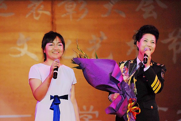 梦鸽还与我校吴思嘉同学一起演唱了《军民团结一家亲》。