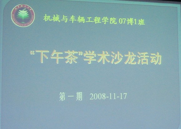 2008年11月17日,机械与车辆工程学院07博一班在一号教学楼举行了“下午茶”学术沙龙活动。本次学术沙龙活动得到了学院的大力支持,“下午茶”这种形式在国外的大学校园非常流行,在喝茶时间里,人们不考虑身份和研究领域,畅所欲言地谈论各种感兴趣的话题。思想的碰撞产生智慧的火花。本次活动就是取了“下午茶”的这一层含义,旨在为博士班级里各不同专业方向、不同实验室的同学提供更自由的交流平台,活跃博士党支部的学术气氛,提供更多学术思想创新的可能和机会,促进博士生作为科研创新中坚力量发挥更大作用。