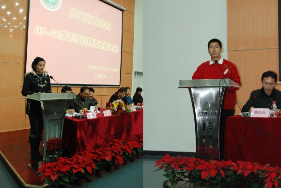 颁奖仪式结束后,获得先进班级一等奖的05220701班代表梁思远同学上台发言,他从班级学风,学习方法和所得效果三个方面总结了班级取得优秀成绩的原因和经验,这也给在座的08级各班班长很多启示。接着张扬同学代表个人获奖同学上台发言,她和大家分享了她自己的学习方法和经验,并主要在英语方面给了大家一些建议,让现场的08级同学获益匪浅。