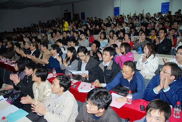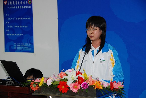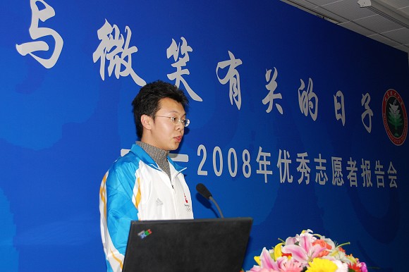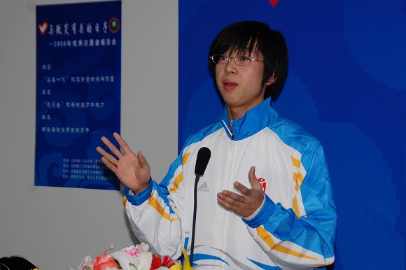 最后一个作报告的是来自材料学院的张鹏同学在奥运会、残奥会期间是志愿者中的明星,他的笑脸是观众在通往场馆路上一道特殊的风景,他的热情几乎感染了路过他岗位的每一个人!张鹏的热情也给其他业务口制造了一些“小麻烦”,负责餐饮业务口的经理就曾经向衡老师投诉,由于张鹏几乎吸引了所有观众的关注,导致与他几米之遥的商品销售点生意非常惨淡。