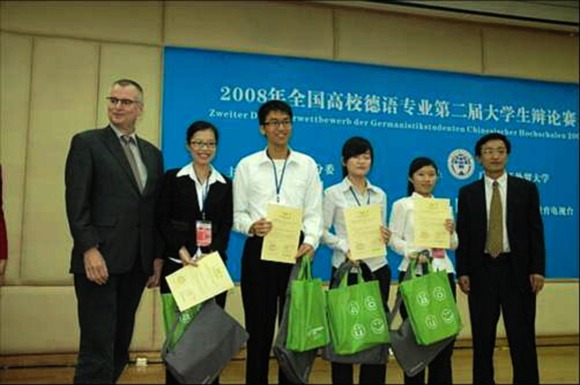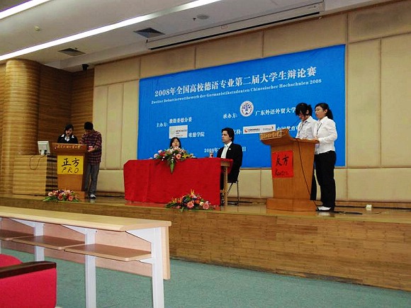 2008年11月14、15日,全国高校德语专业第二届大学生辩论赛在广东外语外贸大学隆重举行。来自全国37个高校德语系的74名选手同台竞技,大家一决高低,志在必得。 我校德语系2005级的熊蔷同学和2006级的于冬冰同学凭借扎实的功底、凌厉的攻势和机智的临场发挥,一路过关斩将,最终与广东外语外贸大学并肩获得二等奖。(详情请点击详细报道)