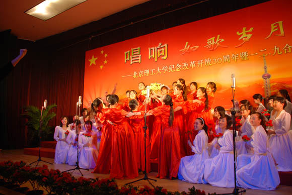 为纪念改革开放30周年和“一二·九”运动73周年,更加有效地对学生开展爱国主义教育,2008年12月7日晚19:00,校团委在中心教学楼一楼报告厅隆重举行了“唱响如歌岁月”——纪念改革开放30周年暨“一二·九”合唱比赛。
