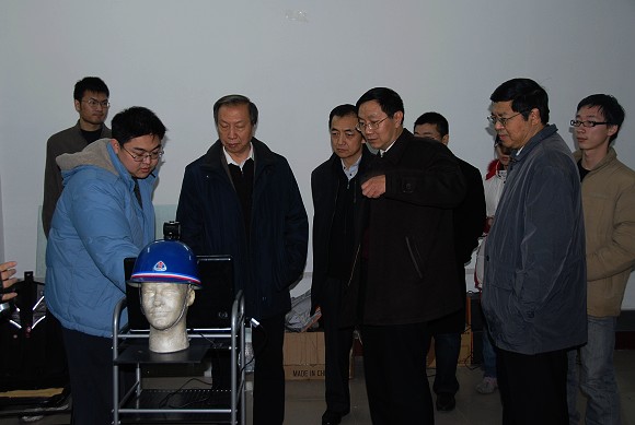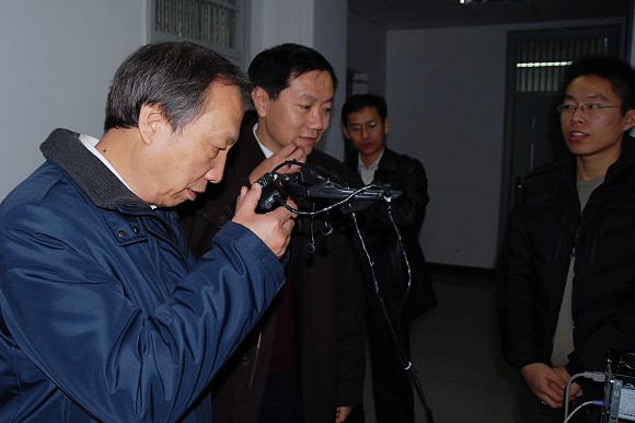 随后,赵副部长一行参观了我校光电信息与颜色工程研究所。他首先参观了国家“863计划”目标导向类项目“支持先进装备技术的轻量级飞行模拟器”和“鼻腔镜手术导航系统”。轻量级飞行模拟器采用增强现实技术,通过轻便的透视式头盔显示器配合真实的飞行座舱,可以实现飞行员的各种日常模拟飞行训练科目。鼻腔镜手术导航系统通过高精度的位置跟踪技术,实现了增强现实手术导航,为增强现实技术在医学领域的应用开创了先例。